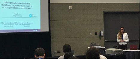 Anita Donlic, Jason Xu, Angela Liu, Carlos Roble, Emily J. McFadden, Malavika Puri, and Amanda E. Hargrove. “Utilizing small molecule tools to identify and target structural motifs in an oncogenic long non-coding RNA”; 256th ACS National Meeting. Division of Biological Chemistry; Graduate Student & Postdoctoral Fellow Symposium. Boston, MA. August 20, 2018. (oral presentation)